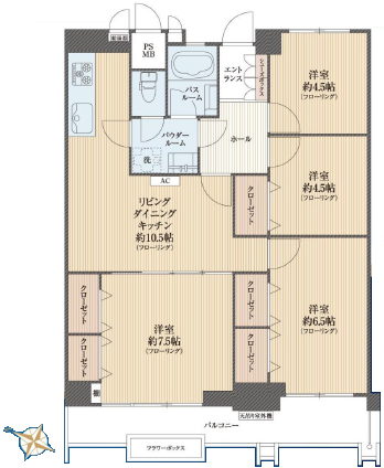 洋室約7.5帖、約6.5帖、約4.5帖×2、LDK約10.5帖