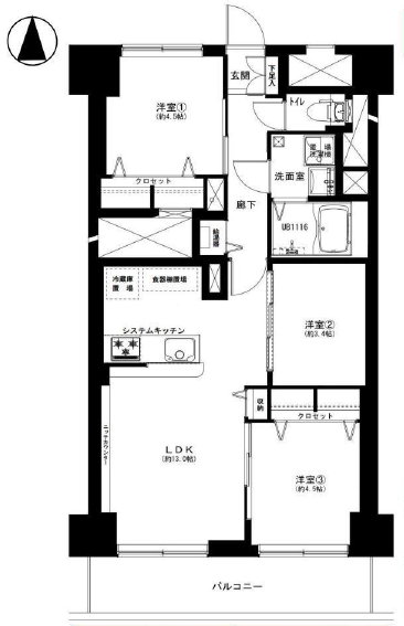 洋室約4.5帖×2、約3.4帖、LDK約13.0帖