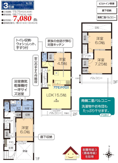 | 間取り詳細 | 洋室約7.25帖、約6.0帖×2、約4.5帖、LDK約15.5帖 |