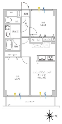 洋室約6.7帖、約4.5帖、LDK約10.3帖