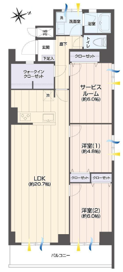 | 間取り詳細 | 洋室約6.0帖、約4.8帖、サービスルーム約6.0帖、LDK約20.7帖 |