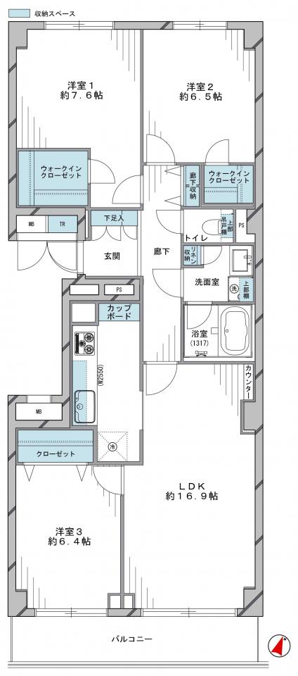| 間取り詳細 | 洋室約7.6帖、約6.5帖、約6.4帖、LDK約16.9帖 |