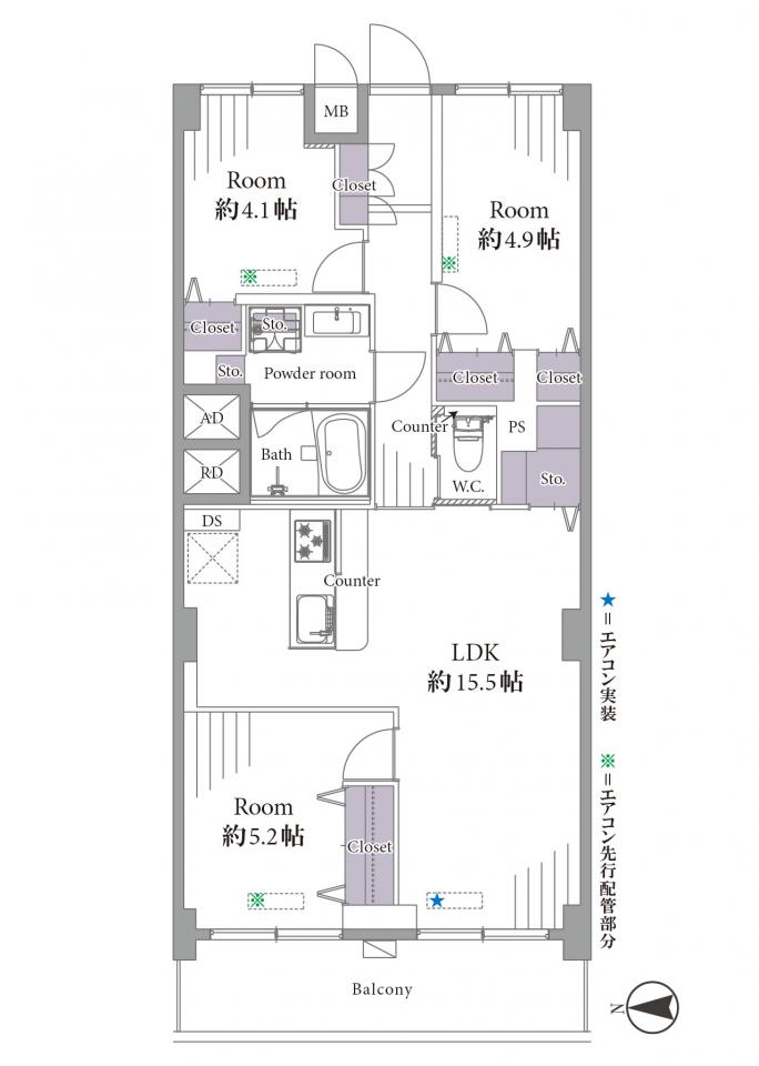 | 間取り詳細 | 洋室約5.2帖、約4.9帖、約4.1帖、LDK約15.5帖 |