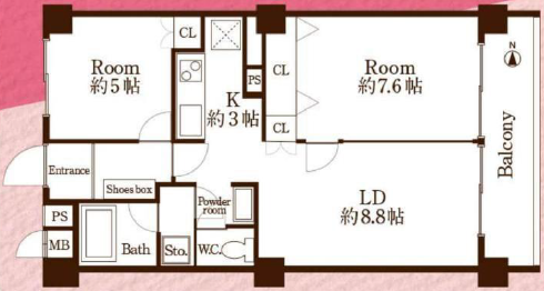 | 間取り詳細 | 洋室約7.6帖、約5.0帖、LD約8.8帖、K約3.0帖 |