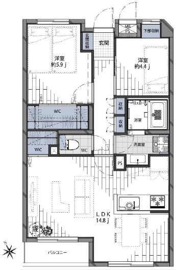 | 間取り詳細 | 洋室約5.9帖、約4.4帖、LDK約14.8帖 |