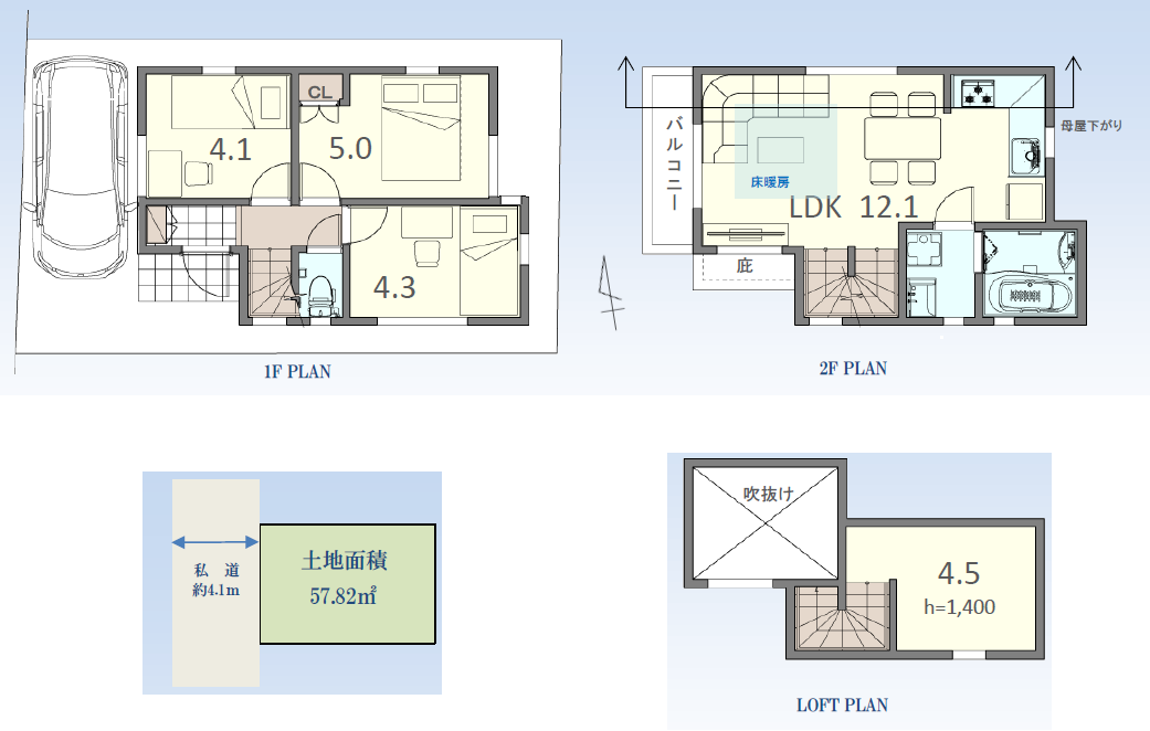 洋室約5.0帖、約4.3帖、約4.1帖、LDK約12.1帖