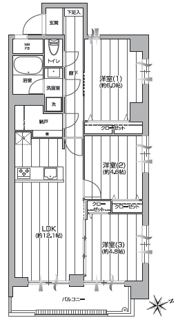 洋室約6.0帖、約4.8帖、約4.6帖、LDK約12.1帖