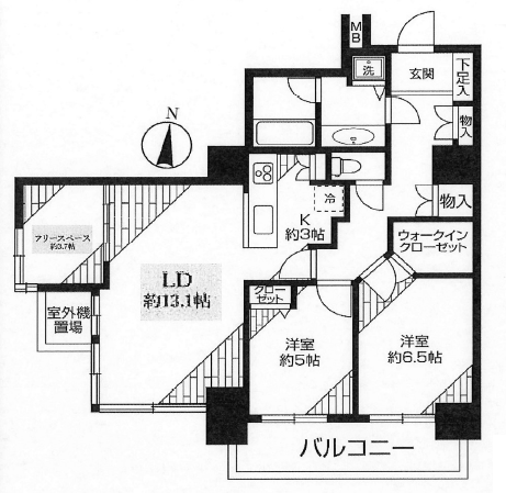 洋室約6.5帖、約5.0帖、LD約13.1帖、K約3.0帖、フリースペース約3.7帖