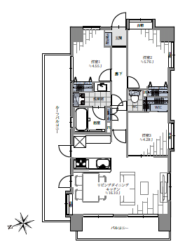 洋室約5.76帖、約4.55帖、約4.28帖、LDK約16.10帖