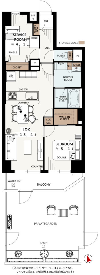 洋室約5.1帖、約4.3帖、LDK約13.4帖