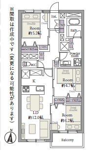洋室約5.2帖、約4.7帖、約4.2帖、LDK約12.0帖