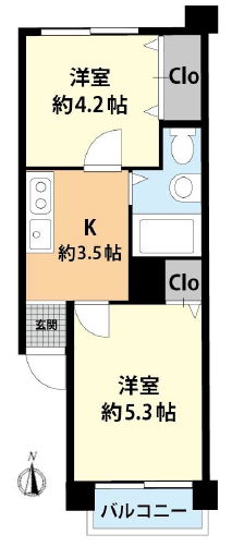 | 間取り詳細 | 洋室約5.3帖、約4.2帖、K約3.5帖 |