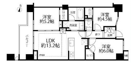 洋室約6.0帖、約5.2帖、約4.5帖、LDK約13.2帖
