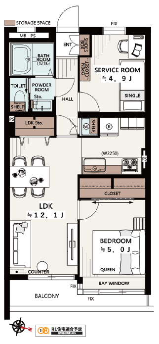 洋室約5.0帖、LDK約12.1帖、納戸約4.9帖