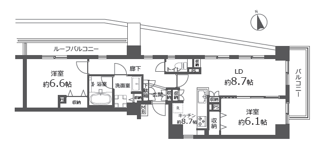 | 間取り詳細 | 洋室約6.6帖、約6.1帖、LDK約10.7帖 |