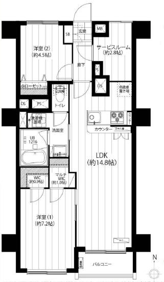 | 間取り詳細 | 洋室約7.2帖、約4.5帖、LDK約14.8帖、サービスルーム(納戸)約2.8帖、マルチWIC約1.0帖、WIC約0.9帖 |