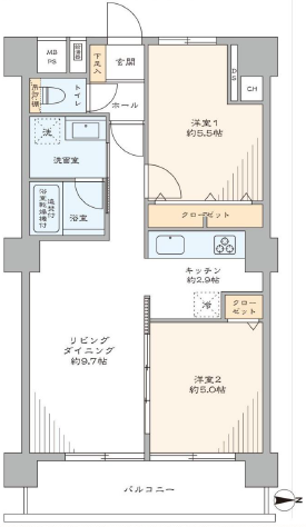洋室約5.5帖、約5.0帖、LD約9.7帖、K約2.9帖