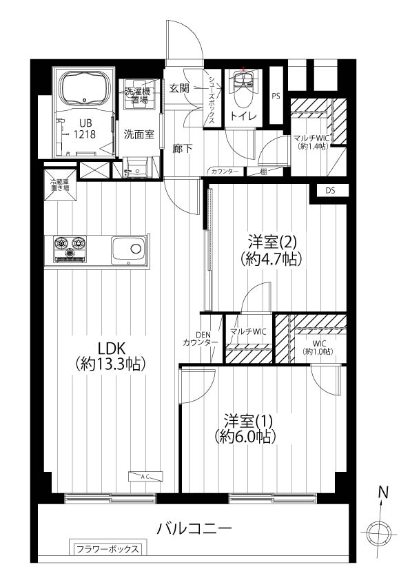 洋室約6.0帖、約4.7帖、LDK約13.3帖