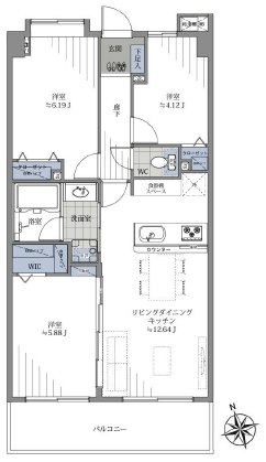 洋室約6.19帖、約5.88帖、約4.12帖、LDK約12.64帖