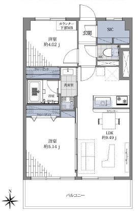 | 間取り詳細 | 洋室約5.14帖、約4.02帖、LDK約9.49帖 |