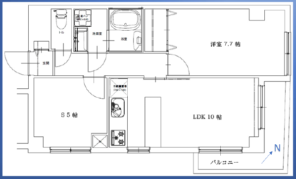 洋室約7.7帖、S(納戸)約5帖、LDK約10帖