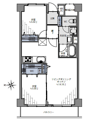 洋室約5.02帖、約5.00帖、LDK約14.16帖