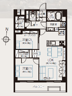 | 間取り詳細 | 洋室約5.5帖、約4.0帖、LDK約14.4帖 |