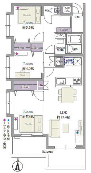 | 間取り詳細 | 洋約5.6帖、約5.3帖、約4.0帖、LDK約13.4帖 |
