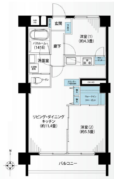 | 間取り詳細 | 洋室約5.5帖、約4.3帖、LDK約11.4帖 |