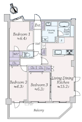 洋室約6.4帖、約6.3帖×2、LDK約15.2帖